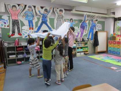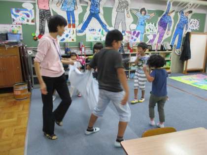 3年生と一緒に交流する,バルーンの事前練習をしました。リズムに合わせて回ったり,素早く手を持ちかえたりすることができました!大きいバルーンで実際に行うのがとても楽しみです!