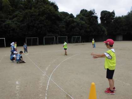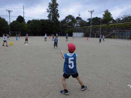 運動会が終わり,通常の体育の授業に戻っています。1組は今日からハンドベースをしています。小さなボールは受け取りにくくて,苦戦していました。