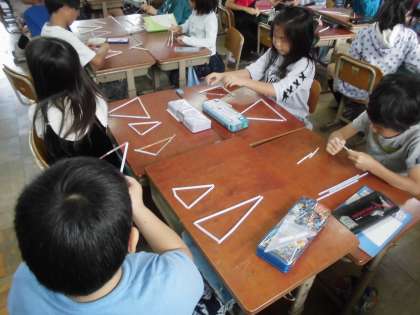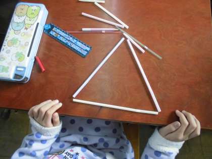 算数で三角形の学習に入りました。ストローを使っていろいろな三角形を作り,正三角形と二等辺三角形について学びました。