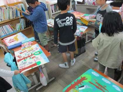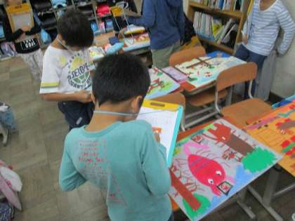 図工でかいていたお話の絵が完成したので、鑑賞をしました。