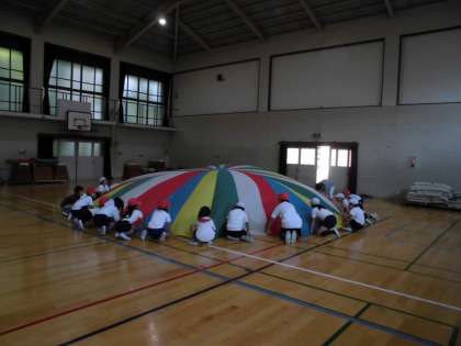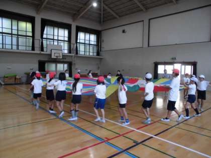 支部育成合同運動会に向けて,3年生と一緒にバルーンの練習をしました。初めての練習でしたが,息を合わせて演技することができました!とても楽しそうに練習をする様子をみることができました。