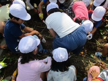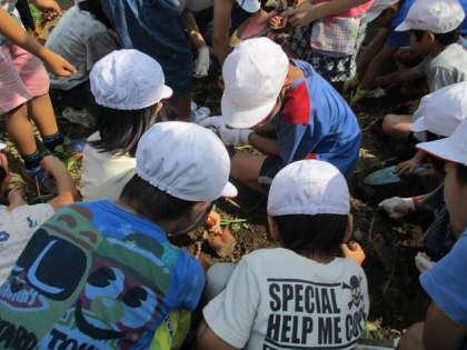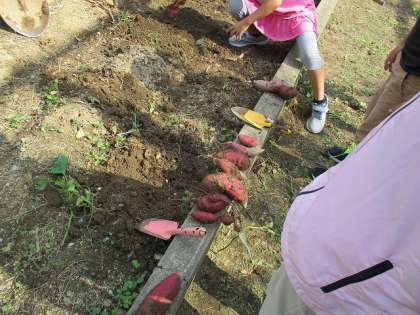 スコップで土を掘るとサツマイモがたくさん出てきて、見つけるたびに子どもたちが喜んでいました。