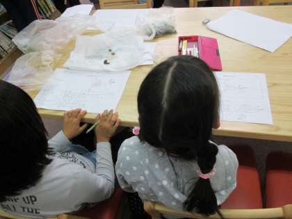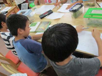 北堀公園で捕まえた生き物を詳しく調べるために図書室に行き、図鑑を見ながら調べました。