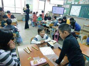 3年生は韓国・朝鮮の「マダン」のお祭りを楽器の写真やビデオを見て学びました。子ども達の遊び「ユンノリ」は韓国朝鮮のすごろくに似ています。みんなで実際に遊ぶことで文化に親しみを持つことにつながりました。
