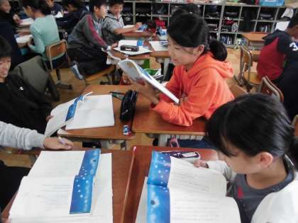 今までの学習を生かして,「朗読」のしかたを考えました。まずは自分で。次にグループで話し合いました。どこをどのように工夫して読むのかを,宮沢賢治が伝えたかったことを想像しながら考えていました。