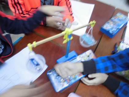 天秤ばかりをつかって身の回りの重さをはかりました。うでの下がったほうが重く,釣り合うとまっすぐになることを確認しました。