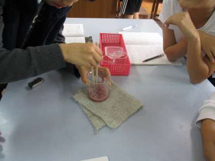 焼きそばの色が変化することに驚き!緑の焼きそばと紫の焼きそばに感激!!液体によって,色と共に性質も変化するということが分かりました。緑から紫(酢を加えて混ぜました)が印象的でしたね・・・。理科ってやっぱり楽しい!不思議がいっぱい!!