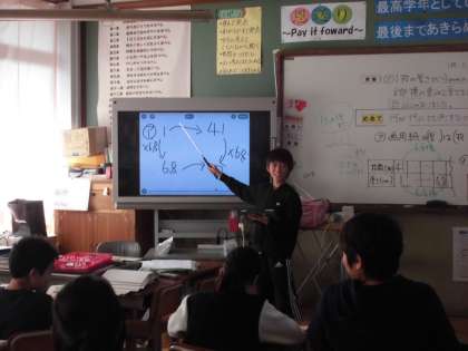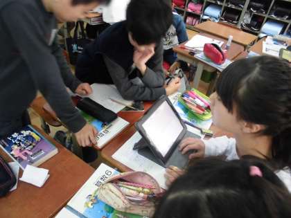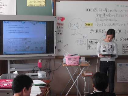 「比例を使って」の学習をしました。今日は文章問題で,比例関係を利用し,工夫して全体のおよその数を求めました。問題はややこしかったのですが,自分で解き方を考えた後,グループでより良い解き方を話し合い,タブレットを使って全体で交流しました。友達の説明を聞いているうちに,分からなかったところも理解することができました。