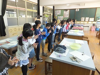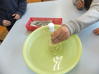 今日はフラスコに栓をしてお湯で温めました。温められた空気の体積が大きくなって栓が勢いよくポンと飛び出しました。みんなが実験した後,大きなフラスコにチューブをつないで寒天で蓋をしました。フラスコを温めると寒天が10mも動きました。