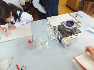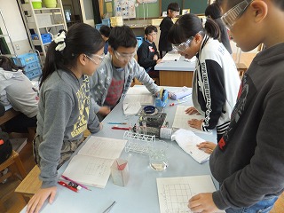 今日は正体不明の4つの水溶液を調べました。リトマス紙で酸性・中性・アルカリ性を調べたり,蒸発皿で蒸発させたり,金属を溶かしたりして4つの水溶液の性質を確かめました。グループで手分けし,役割分担をして手際よく調べることができました。