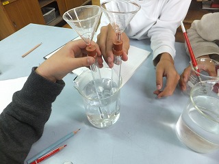 今日は水を温めたり冷やしたりした時の体積の変化を調べました。変化の様子が捉えやすいように,試験管に漏斗を差し込んで調べました。水も空気と同じように温めると体積が増え,冷やすと体積は小さくなりますが,空気と比べると増えたり減ったりする量がとても少ないことが確かめられました。