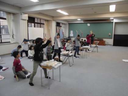 最初は新聞紙を太鼓の代わりにして練習しています。