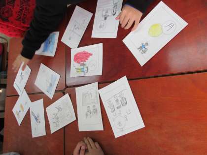 国語では、今までに習った漢字を使って音訓カルタを作成しました。思わず笑ってしまいそうなカルタがたくさんできました。できあがった後は、班でカルタ取りをしました。