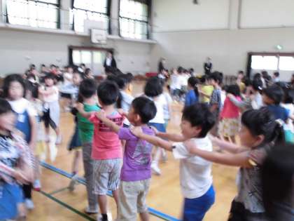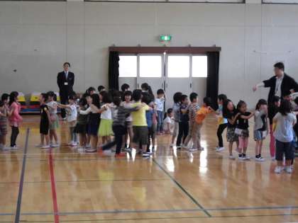 1年生に2年生からペットボトルと自己紹介カードをプレゼントしたあと,体育館でじゃんけん列車やなべなべそこぬけをして交流しました。