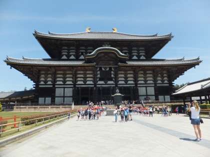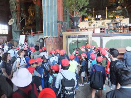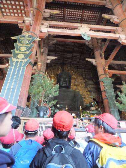 良いお天気に恵まれ,五月のさわやかな風を感じながら,奈良公園を散策しました。奈良駅に着いて歩いていると,早速鹿の姿が。「かわいい!」と喜んだり,「怖い!」と逃げたり大騒ぎでした。初めに全員で東大寺に行きました。想像以上の大仏様の大きさに,「うわっ!でっか!」と驚いて,じっと見入っていました。また,「なんで,右手の中指が出てるん?」「目が少し開いてるな。」と気づいたことを,友達と伝え合っていました。