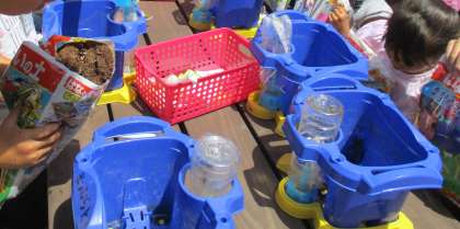 今日は、ミニトマトの種まきをしました。さつまいも・えだまめ・ピーマン・なす・オクラに続いて6つ目の野菜の栽培となります。学年や班ではなく自分の植木鉢への種まきということで子どもたちもやる気満々でした。元気なプチトマトが育つといいですね。