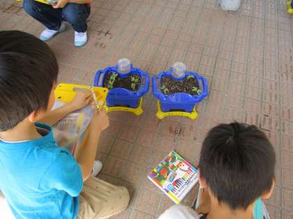 先週,あさがおの種まきをしたところ,さっそくかわいい芽が出てきました。
