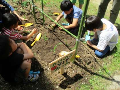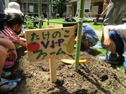 たけのこの畑にトウモロコシ・トマト・えだまめの種や苗を植えました。「大きくなあれ」「芽が出ますように」と願いを込めました!畑は「たけのこVIPファーム」と名づけ,これから一生懸命育てていきます!