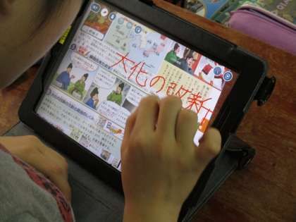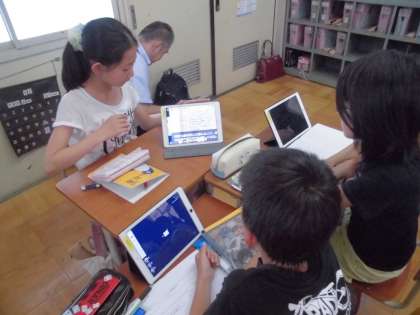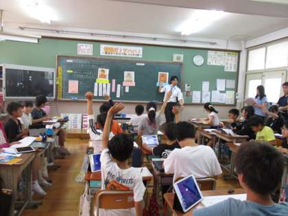 社会科の歴史学習の様子です。今日はタブレットを使って作成した歴史の人物に関するプレゼンを交流しました。グループで「なぜ・どのように・何を」など質疑応答を繰り返し,より理解が深まったようです。