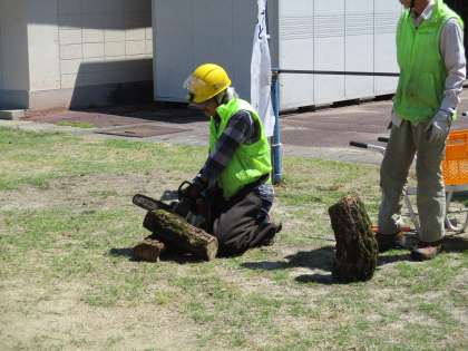 大きくのびたたけのこを見たり,みどりの会のみなさんにチェーンソーで木を切るところを見せていただいたりしました。