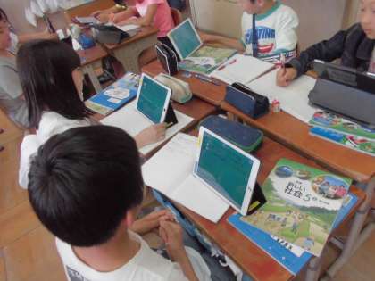 タブレットを使い,日本の国土の特色について,それぞれでまとめたものを班の中で交流していました。相手に分かりやすく伝えることが出来るように工夫していました。また,班で出た意見をまとめて全体でも共有することが出来ました。