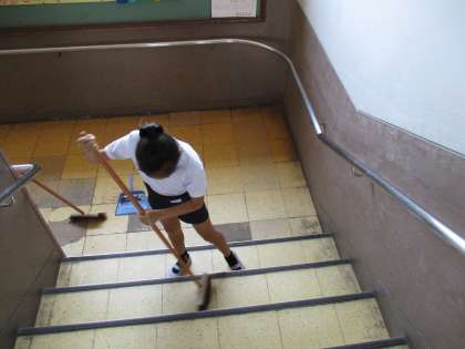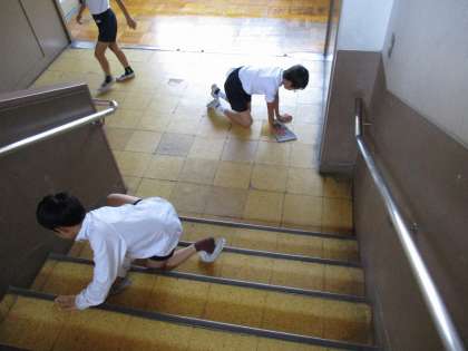 6年生は,玄関や階段,トイレなど,人がよく使う場所の掃除をしています。毎日掃除をしないと,ほこりやゴミがたまって大変です。知らず知らずのうちに,下級生にも見られるということもあり,責任重大です。最後まで,丁寧にお掃除をしています。