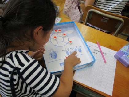 「4つ,まとに入って,6こがはずれたよ。」「9こも入ったよ。はずれは1こだけだったよ。」と子ども達は楽しみながら学習していました。