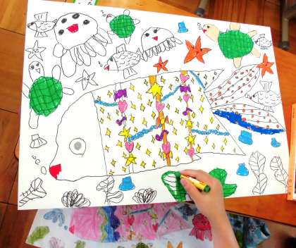 今,図工で『おしゃれなさかな』を描いています。ペンで描いた魚に,クレパスで丁寧に着色しているところです。はみ出さないように気をつけて,薄い色から濃い色へと,色が濁らないように順番に塗っています。