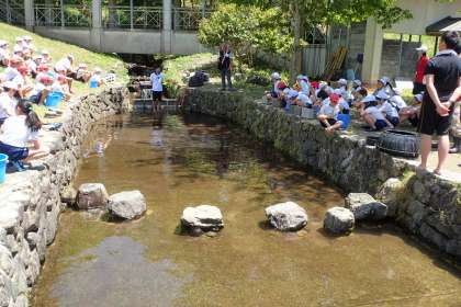おがま池での イワナつかみ。