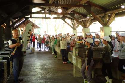 山本先生の説明を聞き,命の連鎖で大きくなったさっきのイワナのさばき方を教わります。