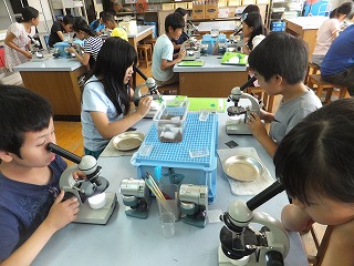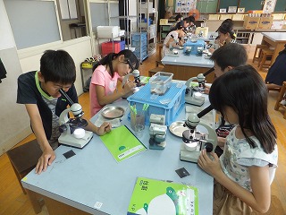 今日はメダカの卵を観察しました。各グループの水槽から卵を採取し,双眼実体顕微鏡や顕微鏡で観察をしました。「眼がある。」・「心臓が動いている。」・「血液が流れている。」・「卵の中でくるりと動いた。」等,いろいろな卵の成長の様子が観察できました。藤城小学校には双眼実体顕微鏡も顕微鏡も人数分そろっているので思う存分観察することができました。