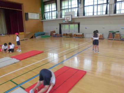 マット運動も3時間目。自分の成功させたい技に何度も挑戦する姿が見られました。