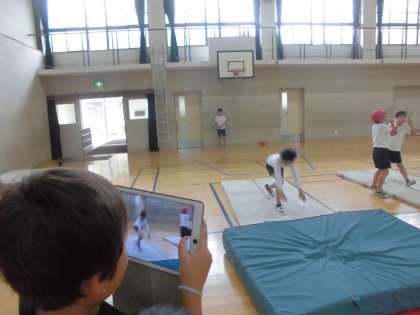 自分の頭の中にあるイメージと,実際に自分ができている姿の違いを確認するためにタブレットを使ってお互いを撮影しました。
