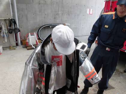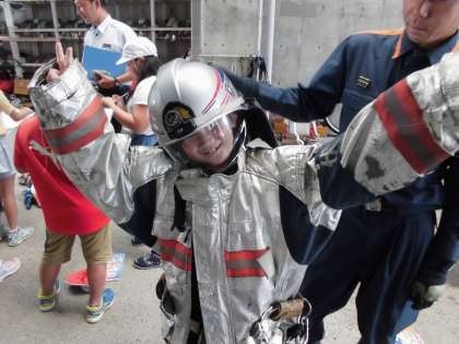 次に,実際に出動するときに着る消防服を着させてもらいました。