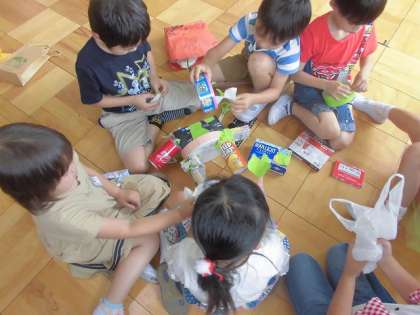 授業用に持ってきていたはこをつかって,自分たちで組み合わせてオリジナルの作品を作りました。