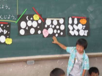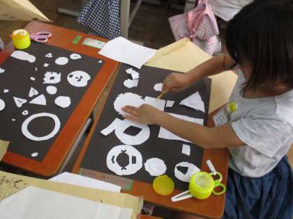 黒い紙に好きな形に切った白い紙を貼って何に見えるかを想像しました。