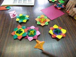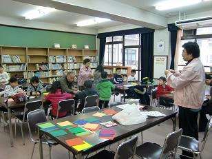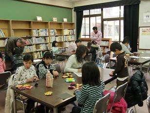 土曜日のふれあい活動〜作ってあそぼう〜が、図書室で開かれました。少年補導委員会の方々を中心に「折り紙のこま」作りに取り組みました。児童館からの参加の子どもたちも一緒に、カラフルなこまをおって、楽しく回して遊びました!