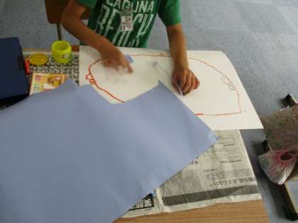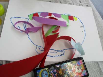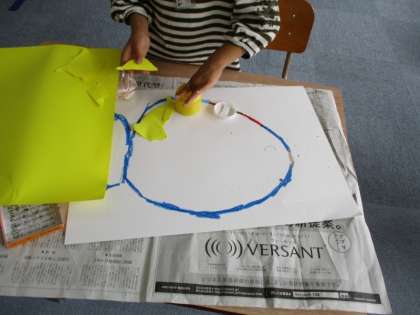 画用紙いっぱいにカラフルなさかなを描きました。いろいろな色の画用紙をちぎって隙間なく貼りつけていきました。「こんな魚がいたらいいなぁ!」と想像を膨らませて完成させました!
