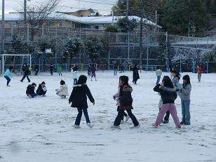 今年の冬一番の冷え込みで雪が積もり、朝の運動場はしんと静かで真っ白です。子どもたちは大喜び。登校してきたとたんに、雪合戦や雪だるまつくりで運動場は、いっぺんににぎやかになりました。