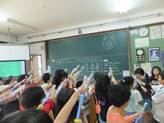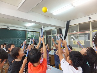 閉じ込めた空気に力を加えるとどうなるか調べました。押し棒を押して力を加えると体積が小さくなり,手を離すと押し棒が元の場所に戻ってきました。その後,空気でっぽうを作って,スポンジ玉を的に向かって飛ばしました。