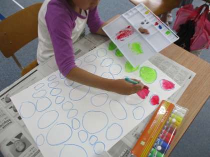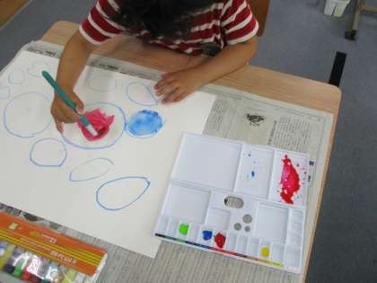 3年生が初めて絵の具を使ってシャボン玉を描きました。絵の具と水の量を調整しながらいろとりどりのきれいなシャボン玉を描きました。