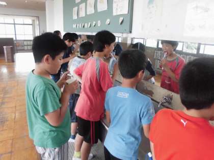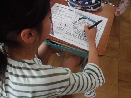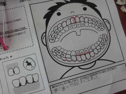 プラークテスターを使って,歯のよごれ調べをしました。「意外と磨けてなかった!」などと気付く子も多く,改めて歯磨きの大切さを実感したようです。