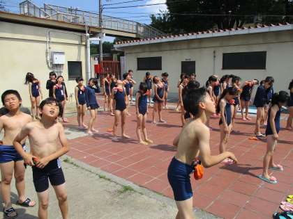 5年生になって初めての水泳学習をしました。しっかり準備体操を行い,水慣れから始めました。