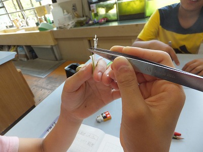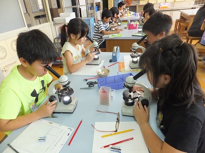今日はアサガオの花粉を観察しました。ピンセットでおしべを抜き,花粉をセロテープに貼り付けました。顕微鏡は1人1台あるので操作も上手になり,すぐにピントを合わせることができました。花粉の周りにとげがあるなどの特徴がしっかり観察できました