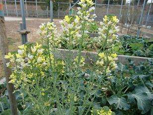 たけのこ学級は第2グランドの学習園でいろいろな野菜を育てています。大根や白菜は、まだ少し収穫できるのですが、ブロッコリーは茎がどんどん伸びて花が咲きました。つぼみの部分が食用なので咲いてしまうと食べられませんが、寒さに負けず咲いた黄色いかわいい花です。