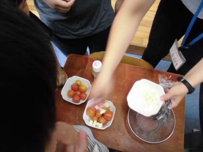 たけのこの畑で栽培していたトマトを収穫し,カプレーゼ風サラダをつくりました。新鮮なトマトと,濃厚なチーズの味わいに「おいしい!」「チーズとドレッシング合うね!」「おっきいトマト食べられた!」と,嬉しそうでした。他の野菜も続々と収穫時期を迎え,一生懸命育ててきた野菜が食べられることを楽しみにしています!