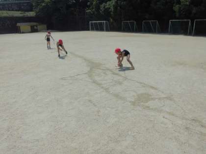 今日は生活科の学習で,ペットボトルやケチャップの空容器に水を入れて,地面に絵をかいたり,友達とかけあいをして夏を肌で感じました。