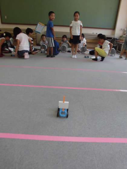 班で一台車を走らせて,弱い風の時・強い風のときと比べました。