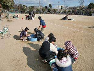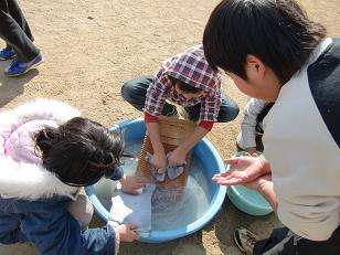 社会科で「むかしのくらし」について学習している3年生。今日は、たらいで洗たく板とせっけんを使い「手」で、洗たくをしました。洗濯機でするのがあたりまえの生活ですが、水の冷たさ、手や腰の痛さをとおして、「むかしのくらし」を実感しました。洗ったぞうきんはとても奇麗になって、気持ちがいいです。