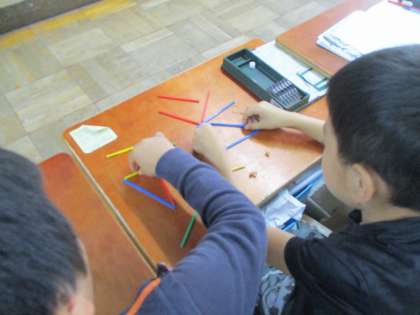 子ども達は同じ長さの棒を使って三角形をつくったり,全て違う長さの棒を使って三角形をつくったりしていました。